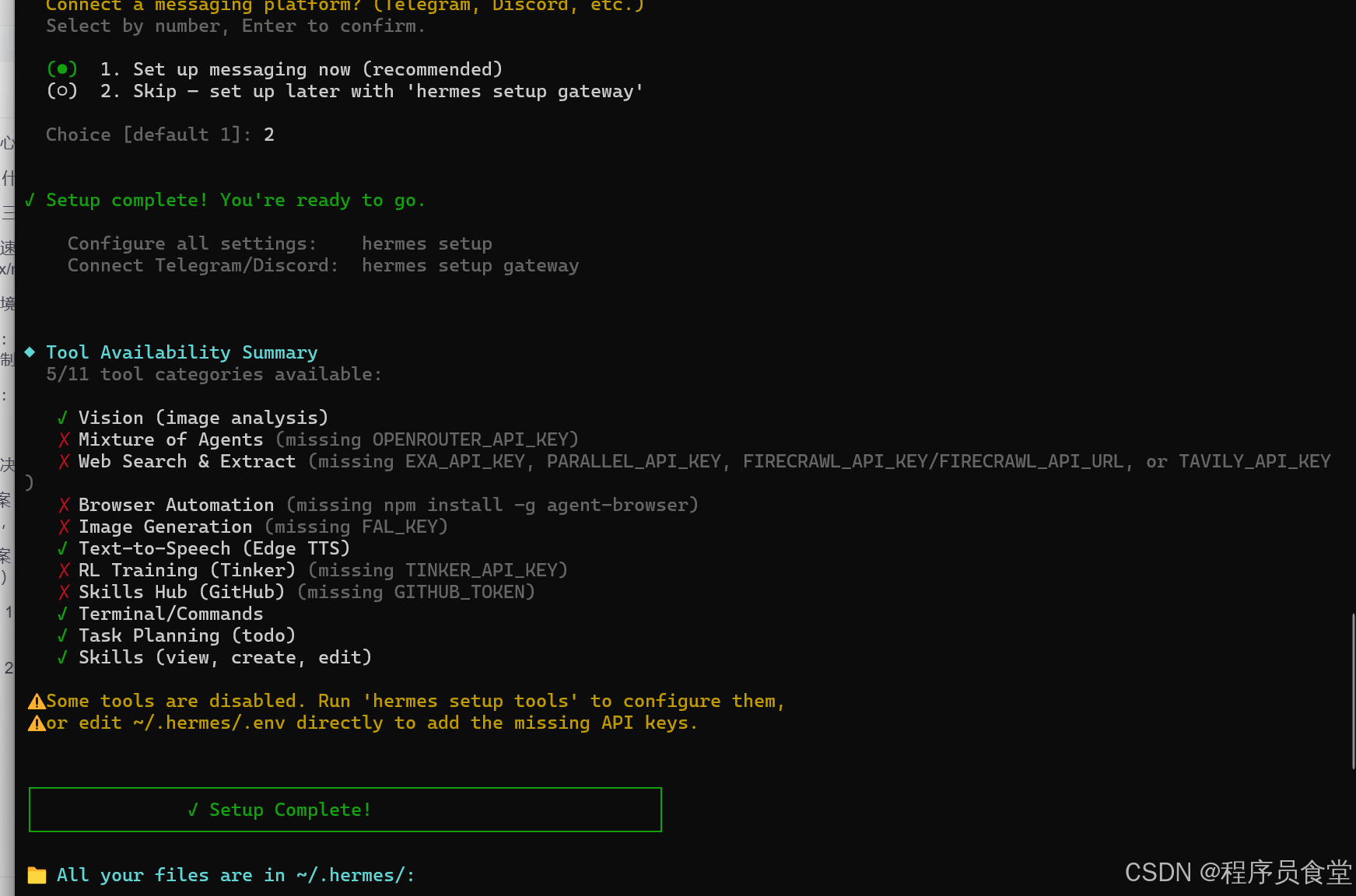 ✅ 强烈建议直接按回车,选默认的 1(Quick setup) ,先把核心功能跑通,后续再用 hermes config 命令慢慢调整高级设置。