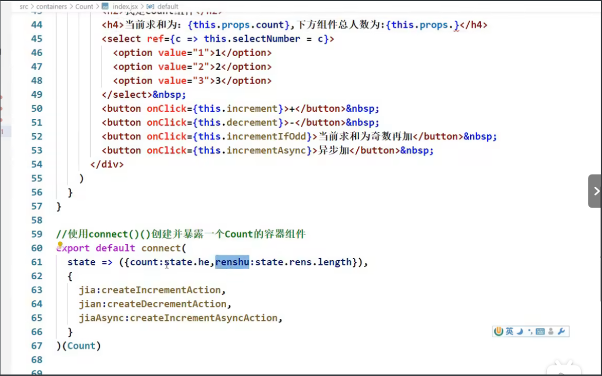 (4). 交给store的是总reducer,最后注意在组件中取出状态的时候,记得"取到位"。