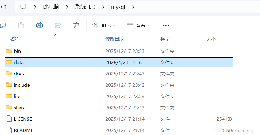 在D:\mysql新建文本文档→重命名my.ini(去掉.txt 后缀),复制下面完整配置(路径直接用 D:\mysql 不用改)