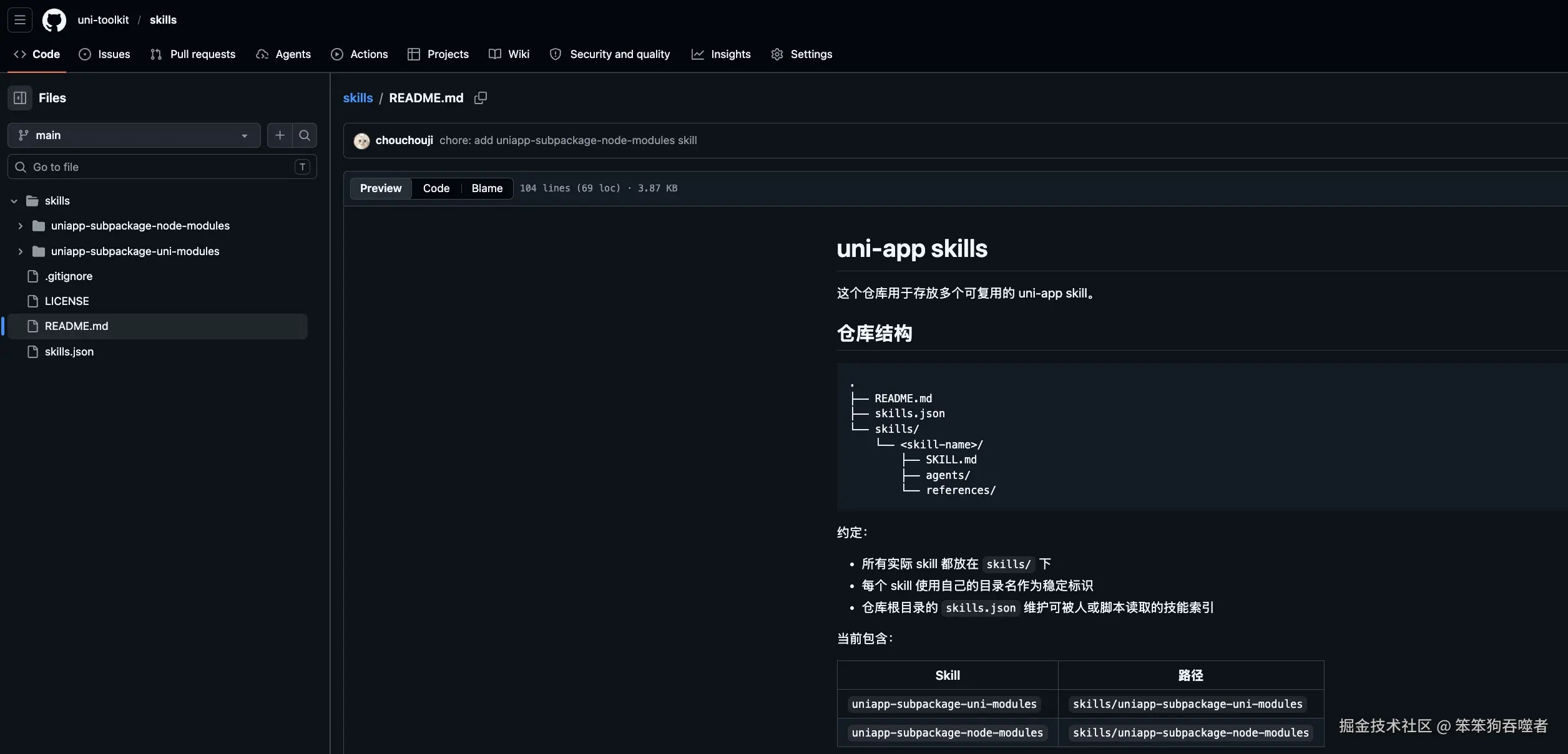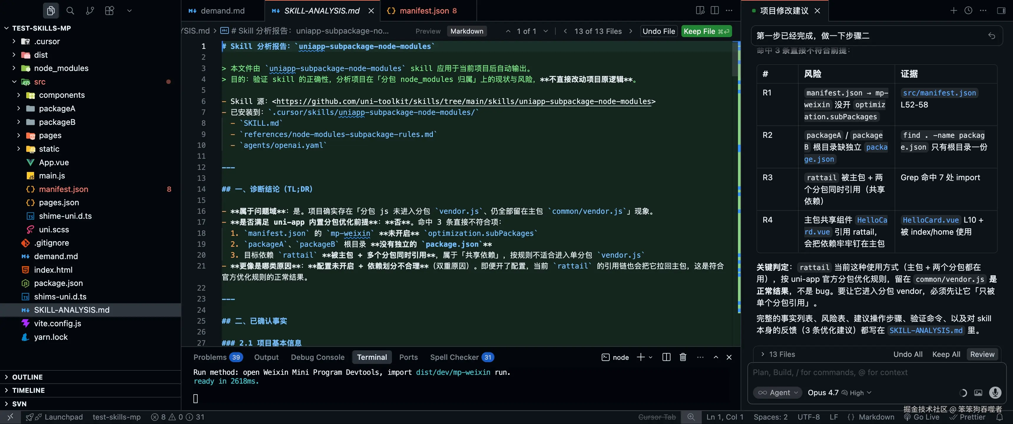前段时间,我创建了 https://github.com/uni-toolkit/skills 项目,用来存放针对 uni-app 主包瘦身的 skills。今天就想着来再试试 Opus 4.7 的能力,同时也验证下我的 skills 是否正确,能否给开发者提供足够合理的建议,下面分享下我的测试流程