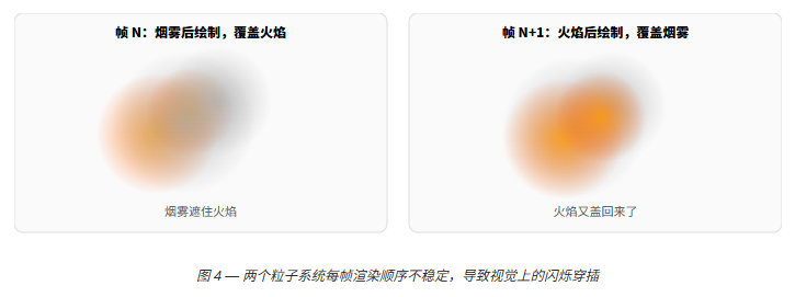 粒子系统"穿插"与传统的"Z-fighting"是两个不同问题: 前者是多个半透明 Renderer 排序不稳定;后者是两个不透明面片深度值精度相近造成交替可见。 解决方案也完全不同。