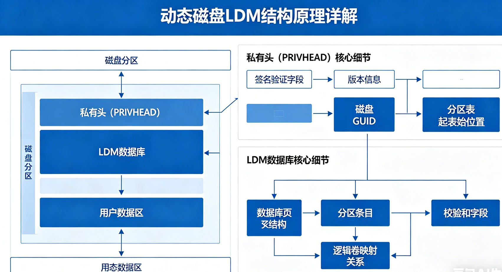动态磁盘是Windows系统为突破基本磁盘局限性而推出的存储管理方案,其所有功能的实现均依赖于LDM(Logical Disk Manager,逻辑磁盘管理器)结构体系。与基本磁盘依赖MBR/GPT分区表的简单管理模式不同,LDM结构通过"磁盘布局+私有头+LDM数据库"的协同设计,实现了灵活的卷管理、跨磁盘扩展、性能优化及数据容错,广泛应用于中高端存储场景。本文将详细解析动态磁盘的整体结构布局、私有头(PRIVHEAD)及LDM数据库的核心细节,控制总字数不超过2000字,清晰呈现核心原理,帮助快速掌握LDM结构的核心逻辑与工作机制。