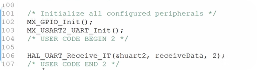 再来看一下中断模式下的串口接收,开启串口中断接收函数也是一样,在HAL_UART_Receive后加上_IT即可。其参数也是一样,只是没有超时时间的设定。不过要注意的是,由于其不会阻塞程序的执行,也就是还没等接收到数据,就会接着向下执行下去,这就会造成当执行到下次循环时,可能是上次的数据还没有接收完成,就又执行开启串口中断接收了,所以我们将其放在循环之前,只执行一次。另外也注释掉轮询模式的接收函数,在轮询模式下HAL_UART_Receive函数是堵塞执行的,当他执行完时,我们就知道数据已经接收完成,放到用于接收的变量里面了。