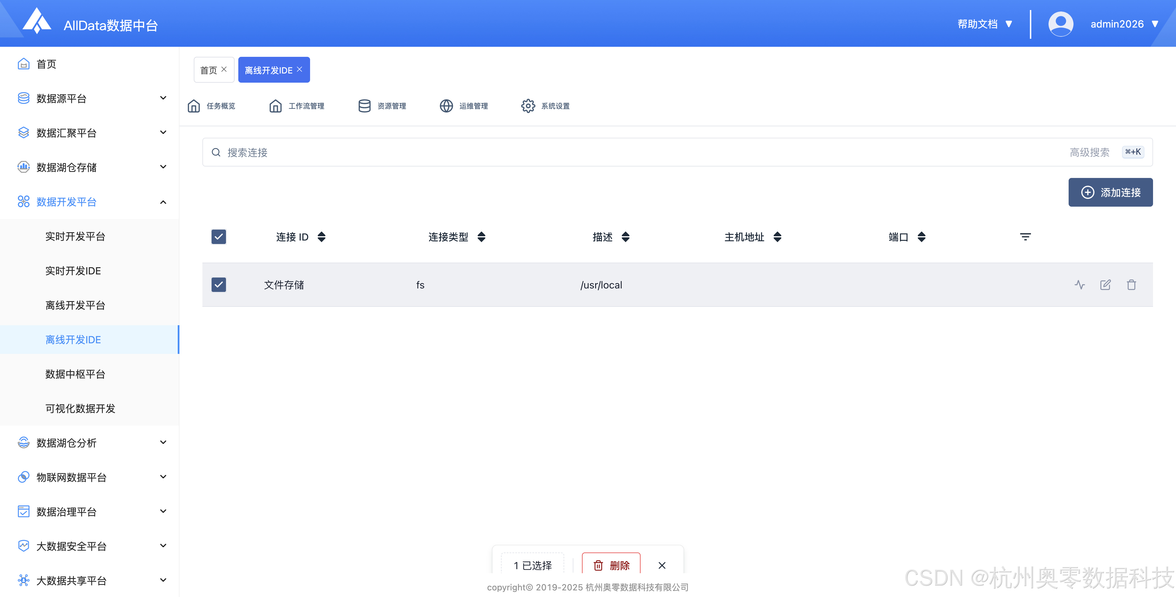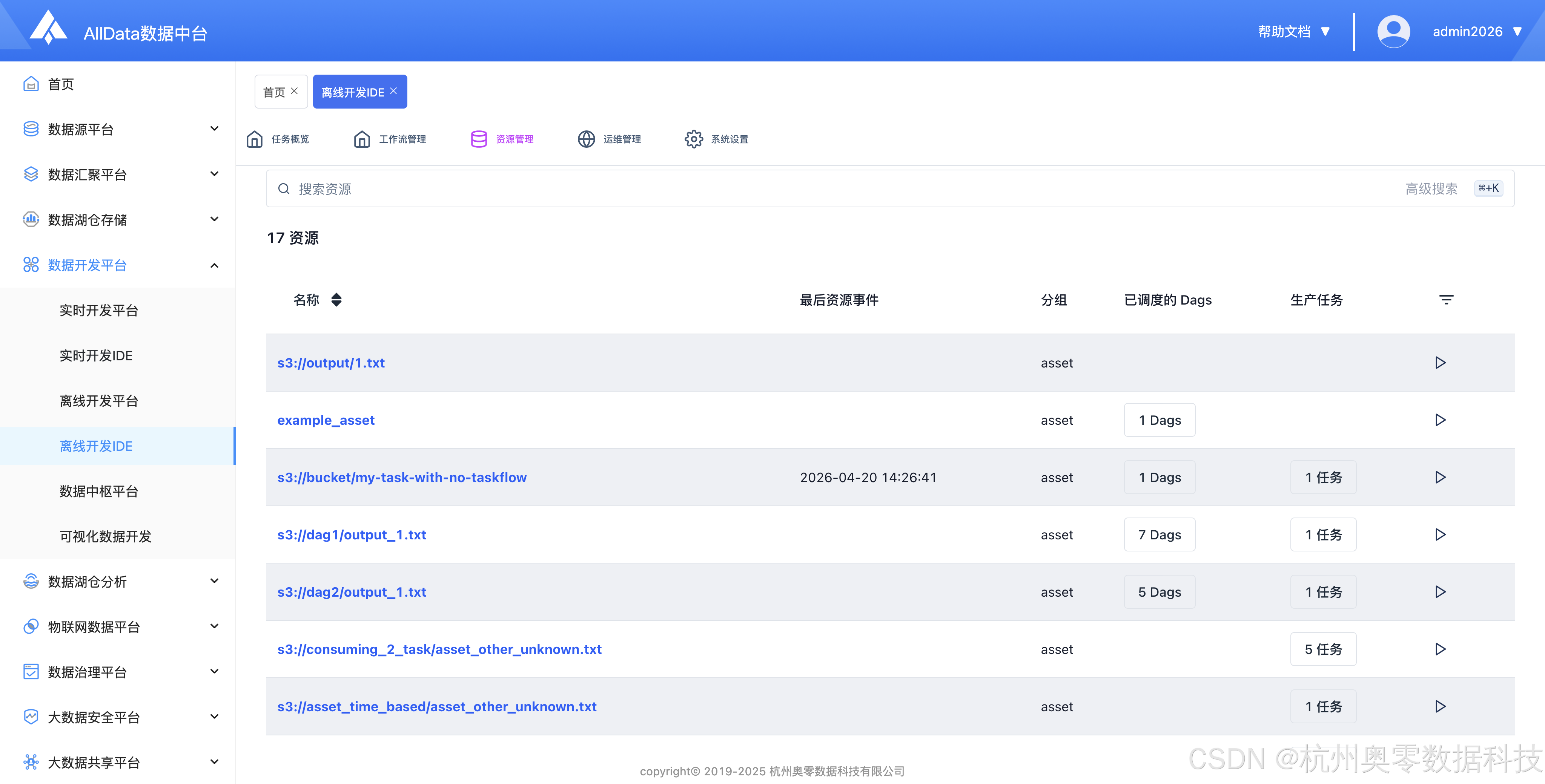 AllData数据中台集成AirFlow构建的离线开发IDE,是 AllData 数据中台集成的可视化任务调度开发环境,支持工作流编排、任务调度、运维监控与系统配置,实现离线数据任务全生命周期统一管理。