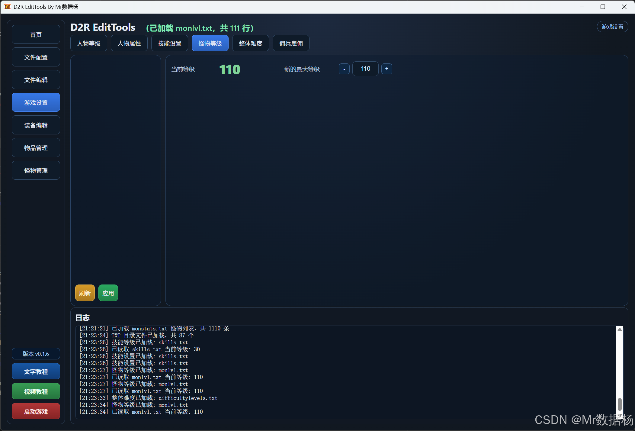 就软件使用路径而言,当前模块的操作流程非常清晰。进入"游戏设置"后点击"怪物等级",页面会先围绕 levelToolTab='mon' 建立上下文。点击"刷新"时,前端读取 monlvl.txt 并计算首列最大等级。输入目标值并点击"应用"后,前端只把 monMax 传给后端命令,后端完成整张曲线表的调整。也就是说,界面上虽然只有一个数字输入,但背后改动的是整条等级曲线。