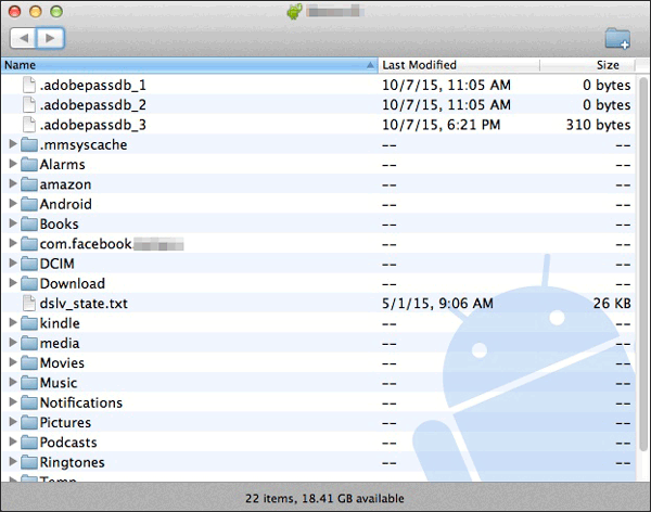 - 打开 Android File Transfer,软件会自动识别安卓手机并显示设备数据。