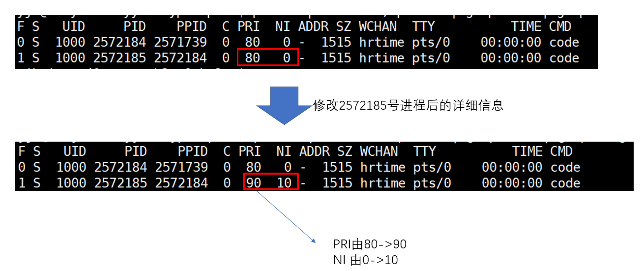 这是一个现象,接下来我们试着再将2572185号进程的nice值更改为-10看看优先级会发生怎么样的变化: