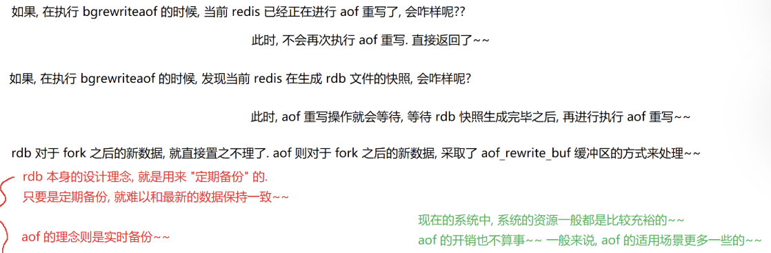 执行 AOF 重写请求。 如果当前进程正在执行 AOF 重写,请求不执行。如果当前进程正在执行 bgsave 操作,重写命令 延迟到 bgsave 完成之后再执行。