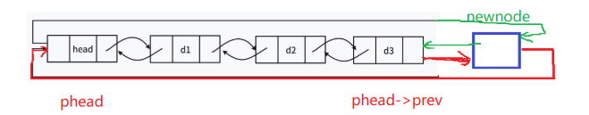 这两行代码不能交换位置:如图,phead->prev 指的是 d3 ,这里是要让 d3 指向新的节点(newnode),再让头节点前驱指向新的节点,形成新的循环。