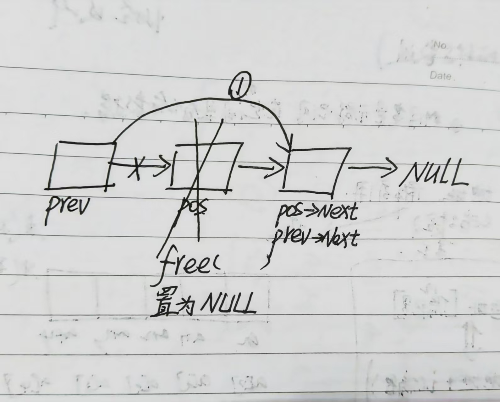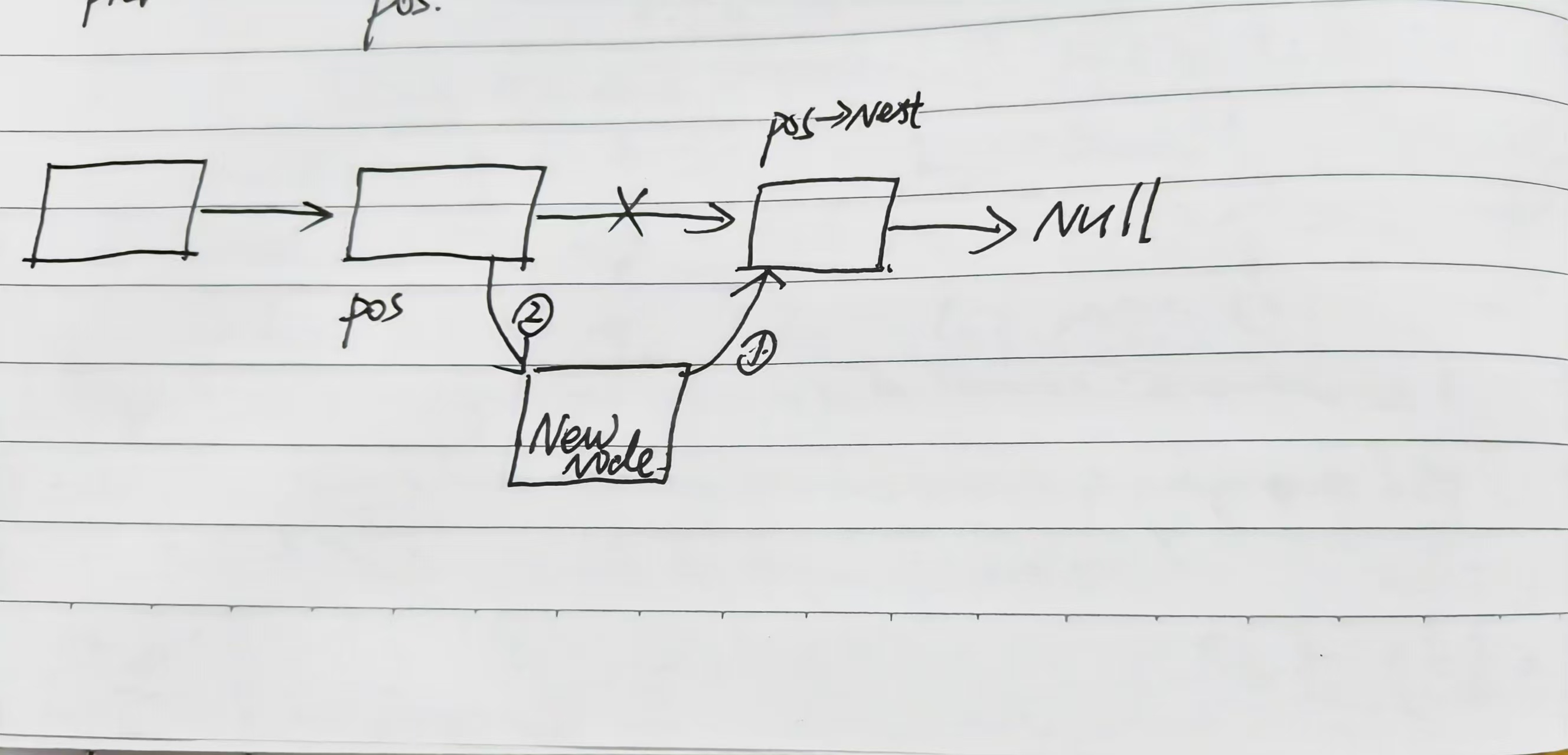 其次 分类 为啥呢?画图 当且仅有一个有效节点时,prev的下个节点一直是空 永远不等于 pos循环不会结束 避免这种情况的发生所以选择 分支去隔离 当是这种情况的时候就直接调用 头插的函数就 ok