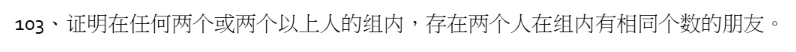 假设有人谁也不认识,那么其他人肯定最多认识剩下的n-2个人,此时能被认识的人数就是[0,n-2],很明显没有n种认识方法,因此必定有两人的朋友数相同。