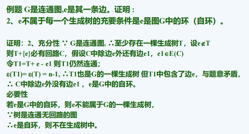假设G图有一边e不存在于生成树T中,则将e加入树T后就会产生环,环可能有另一条边e1,去掉e1,保留e,T仍然是树,但此时e就存在T中了,矛盾。因此回路中仅有e,e是自环。