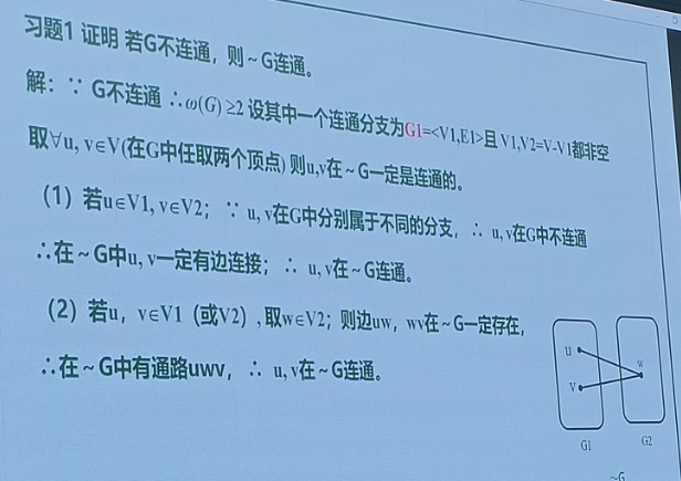 如果在同一个联通分支,就在另一个分子找一个w点,这样由前面证明这两个点与w中的这个点一定联通,因此二者在补图中也联通。
