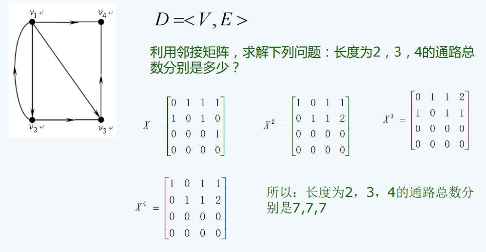 邻接矩阵的幂运算实际上就是可达矩阵/路径矩阵的运算,运算后不为零的地方就是可达的,有几条通路就是多少。