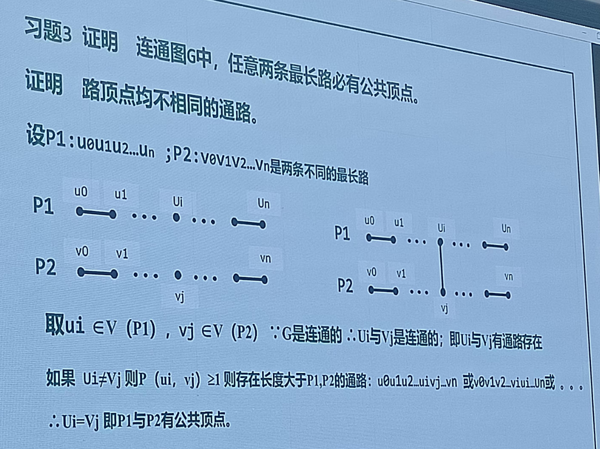 假设有最长路P1从v0到vn、P2从u0到un,则假设两路径不相交,由于连通性,必然找得到一条路径从最长路P1到P2的一点,此时从v0到un就存在更长路径。