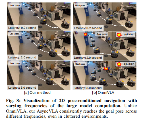 - 随着延迟升高,OmniVLA 性能快速崩塌,频繁碰撞、偏离路径。