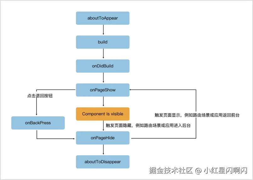 组件的生命周期: aboutToAppear -> build -> onDidBuild -> aboutToDisappear。
