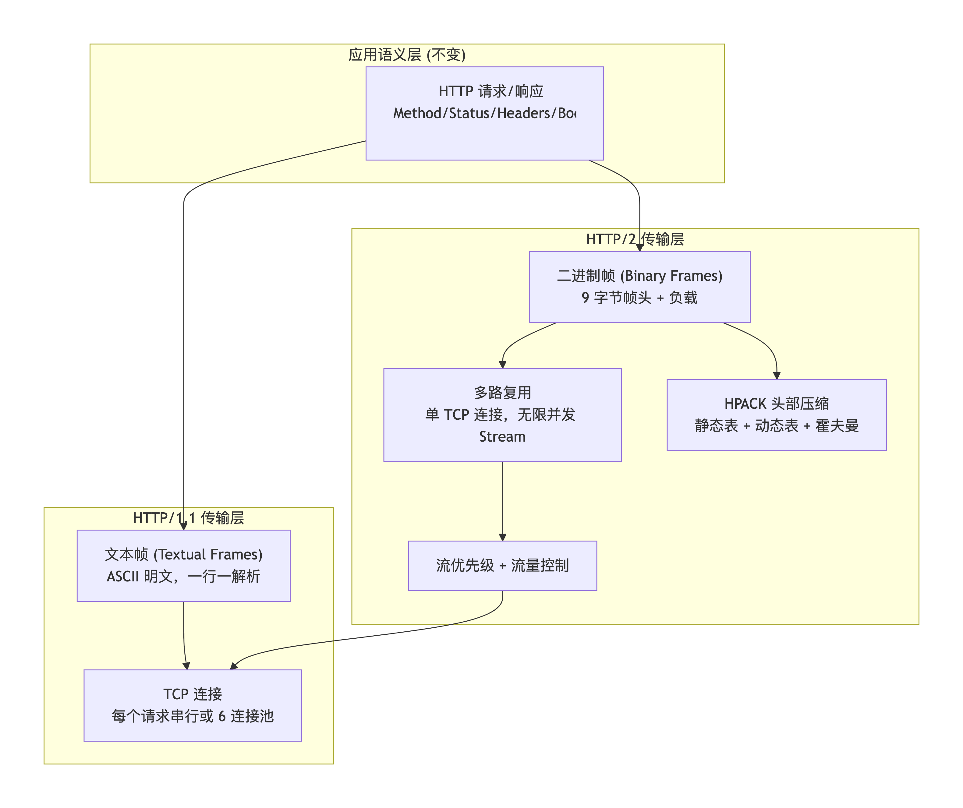 一句话总结这次进化的本质:HTTP 的语义(请求/响应、状态码)没变,变的是"怎么打包"和"怎么在 TCP 管道里调度"。