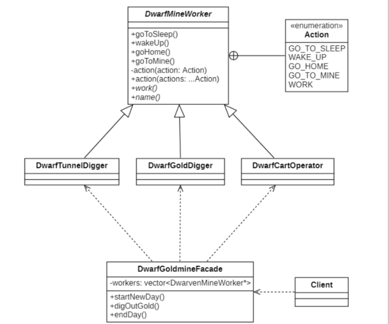 javaimport java.util.Arrays; import java.util.List; public class DwarfGoldMineFacade { private final List<DwarfMineWorker> workers; public DwarfGoldMineFacade() { workers = Arrays.asList( new DwarfTunnelDigger(), // 小海 new DwarfGoldDigger(), // 小超 new DwarfCartOperator() // 小图 ); } public void startNewDay() { workers.forEach((worker) -> worker.action(DwarfMineWorker.Action.WAKE_UP, DwarfMineWorker.Action.GO_TO_MINE) ); } public void digOutGold() { workers.forEach((worker) -> worker.action(DwarfMineWorker.Action.WORK) ); } public void endDay() { workers.forEach((worker) -> worker.action(DwarfMineWorker.Action.GO_HOME, DwarfMineWorker.Action.GO_TO_SLEEP) ); } } -