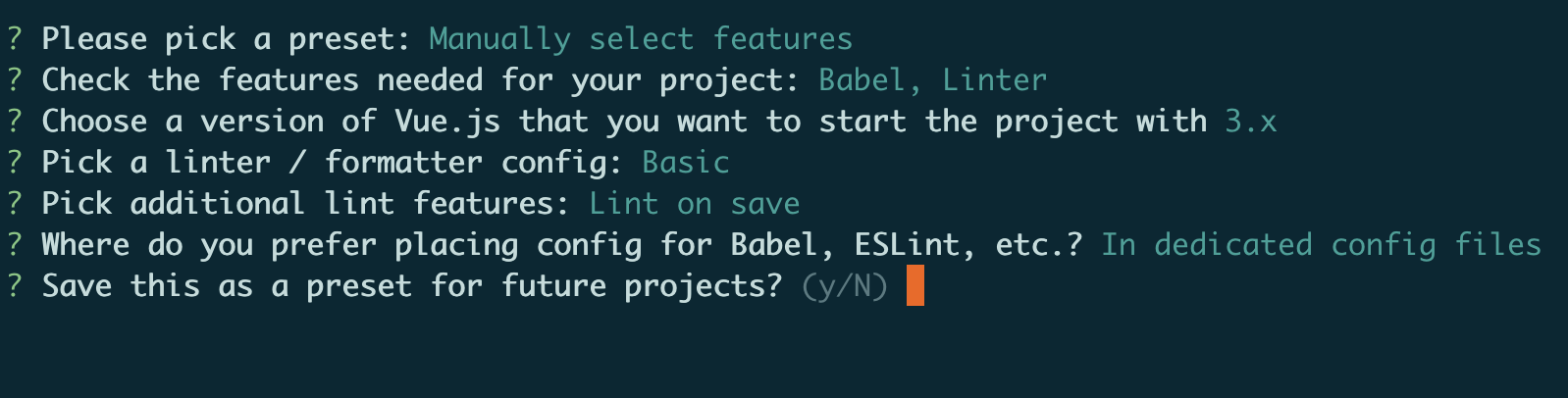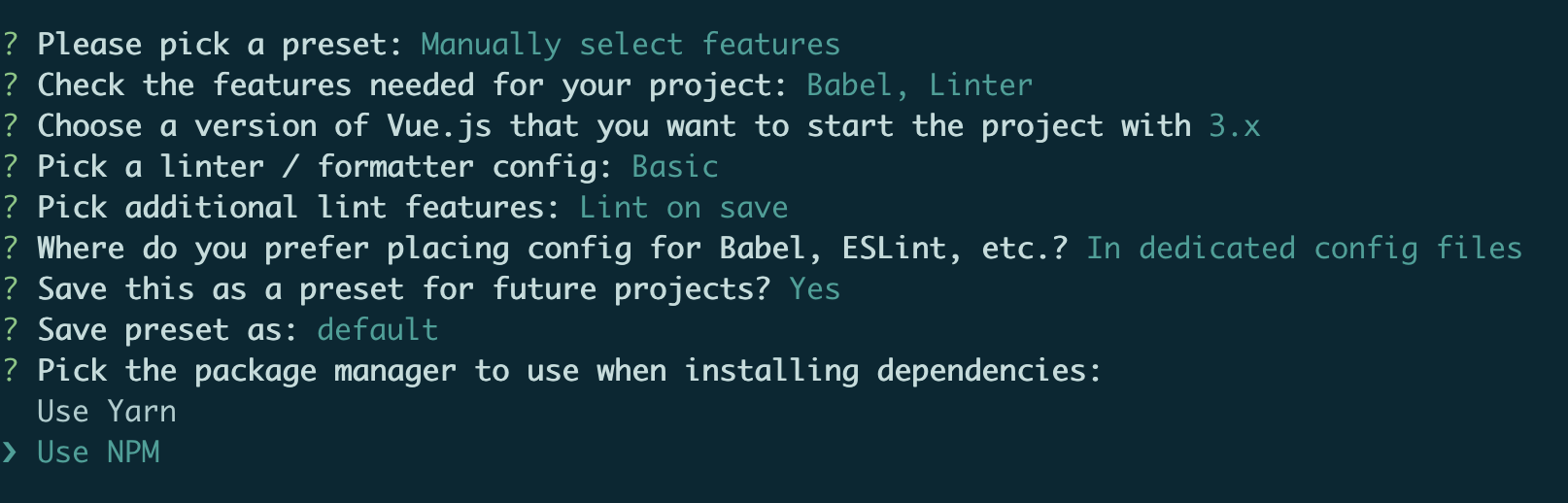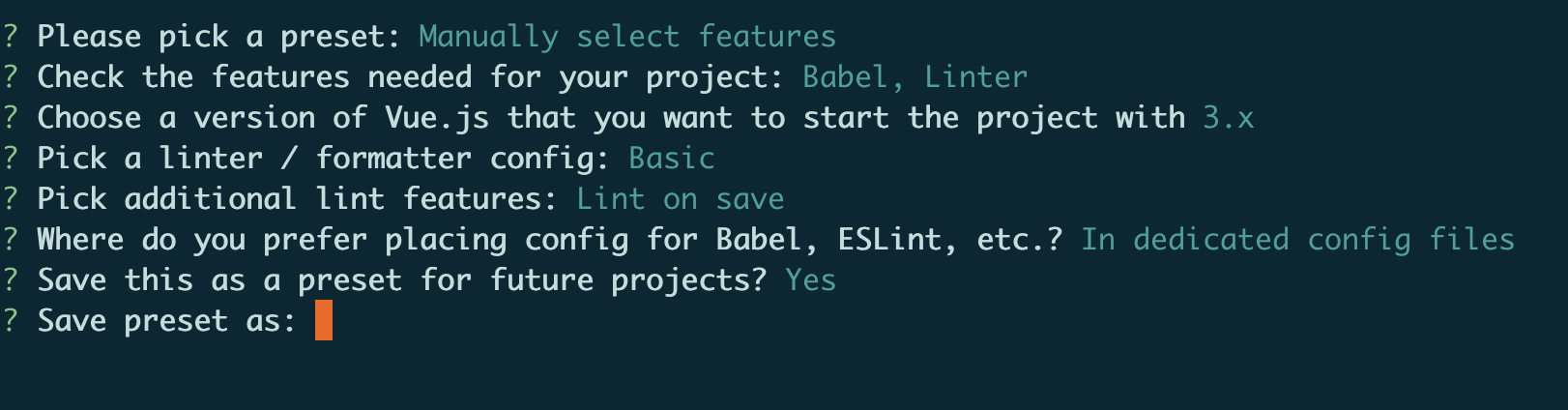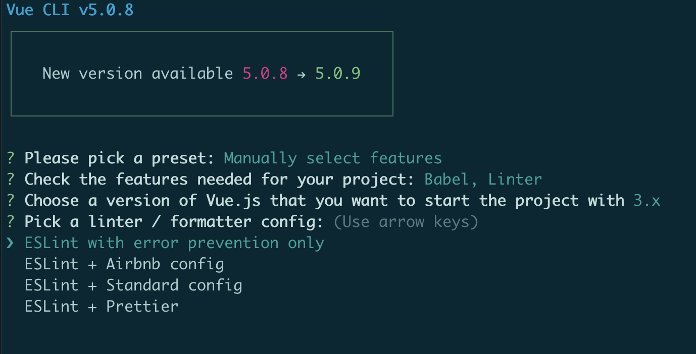 执行命令后,会提示选择一个preset(预设)。一共有3个选项,前两个选项是默认设置,适合快速创建一个项目的原型。第3个选项"Manually select features"需要手动对项目进行配置。这里使用方向键↓选择"Manually select features"选项,如图所示。