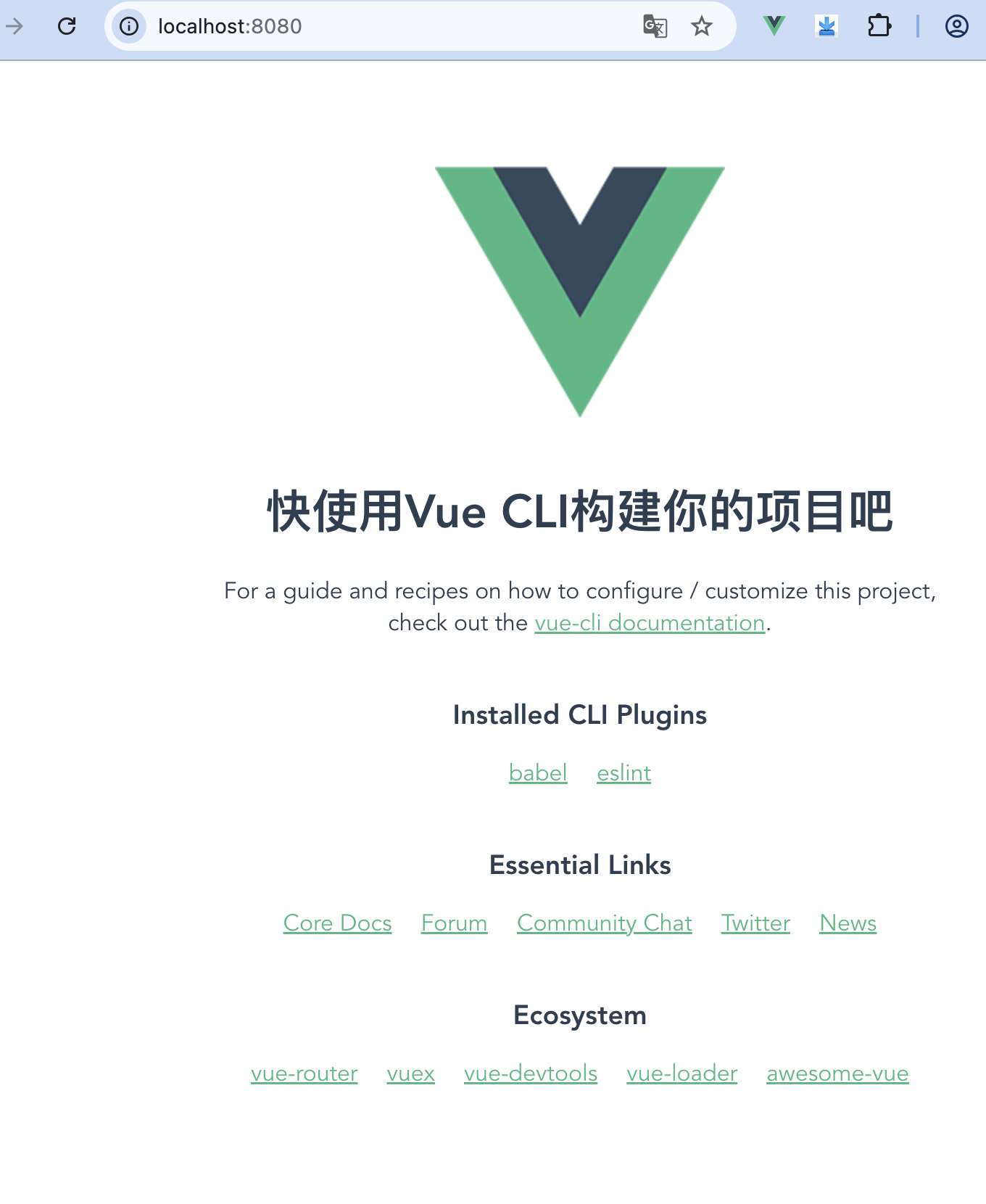 根据提示在命令提示符窗口中输入命令cd myapp切换到项目目录,然后输入命令npm run serve运行项目。项目运行后,在浏览器中访问http://localhost:8080/,生成的页面如图所示。