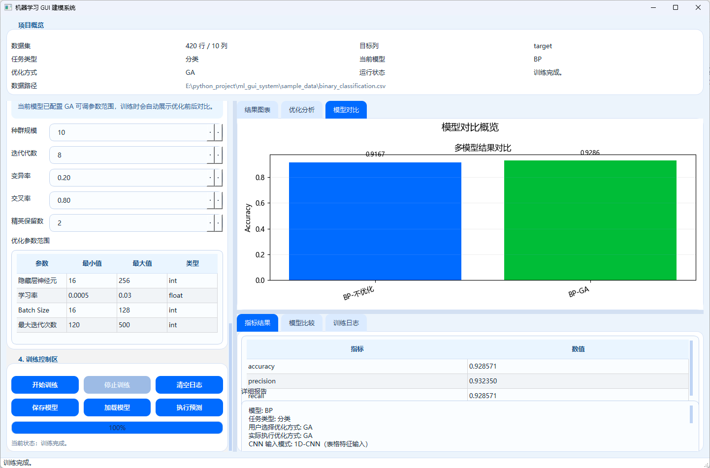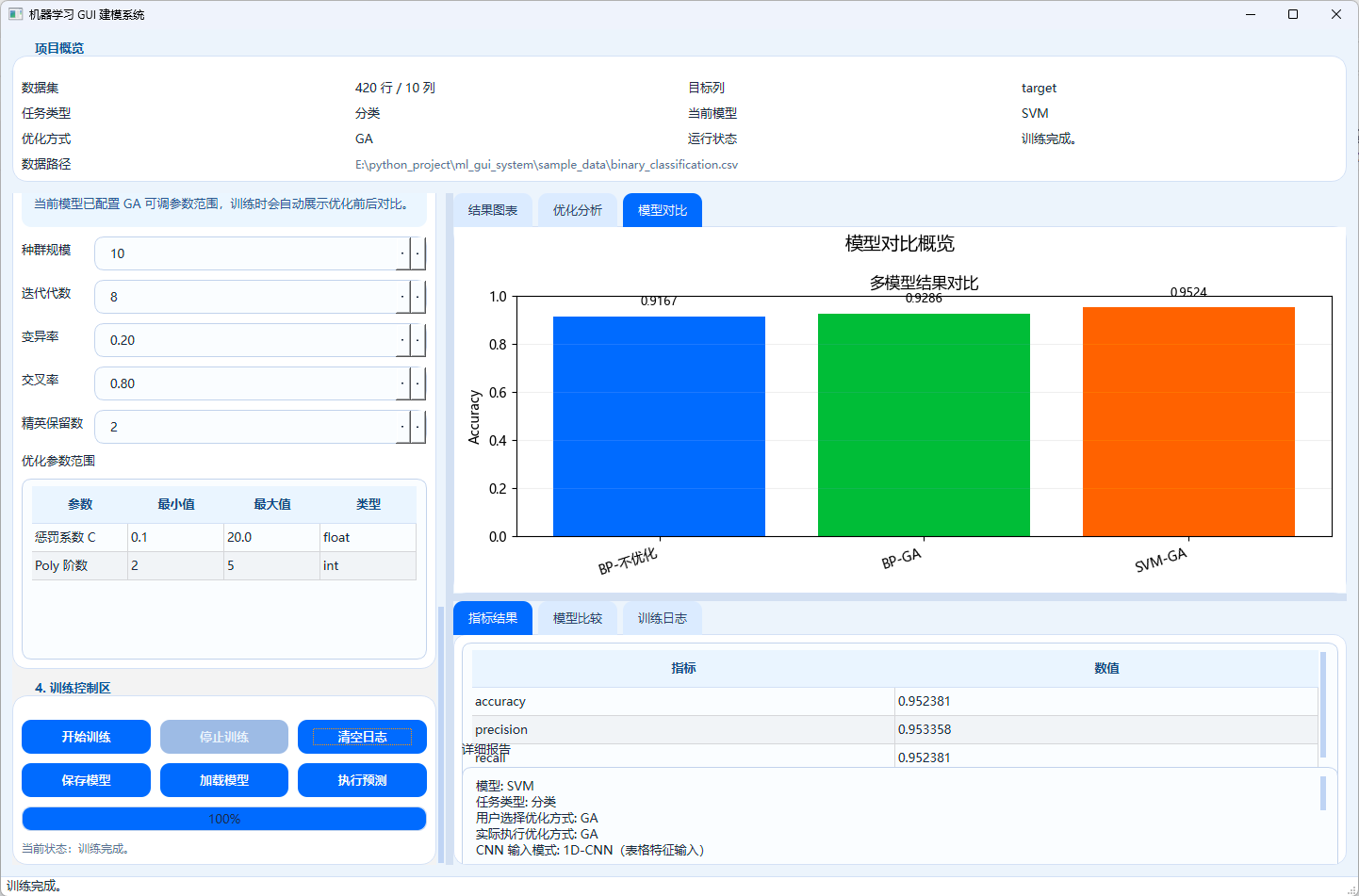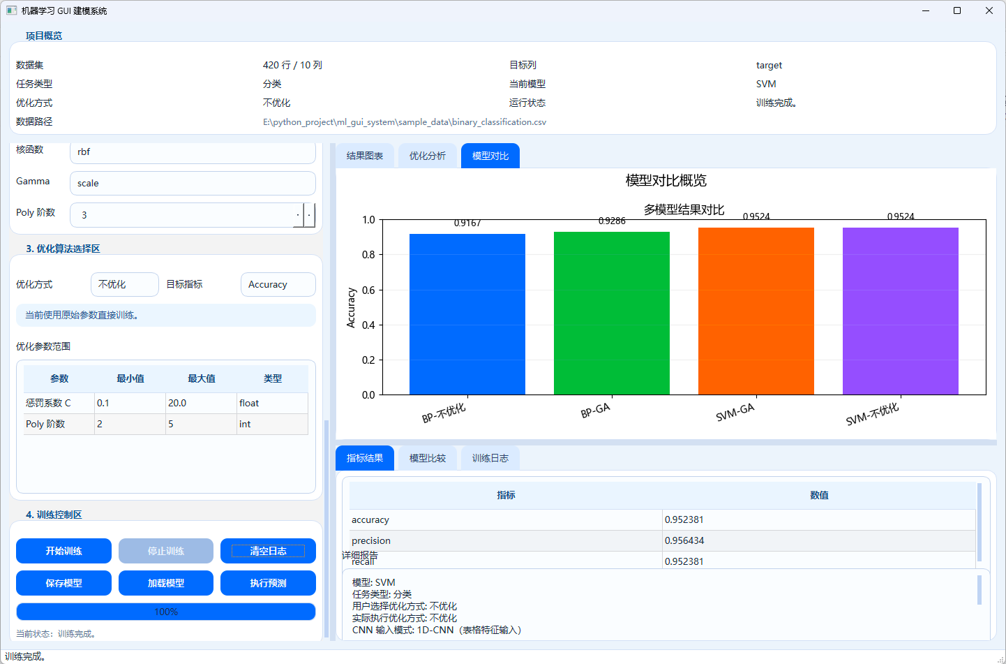 - 主界面收到训练完成信号后,更新指标表、报告文本、图表和模型比较表