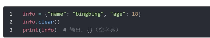 字典名.clear(),删除字典中所有键值对,变成空字典