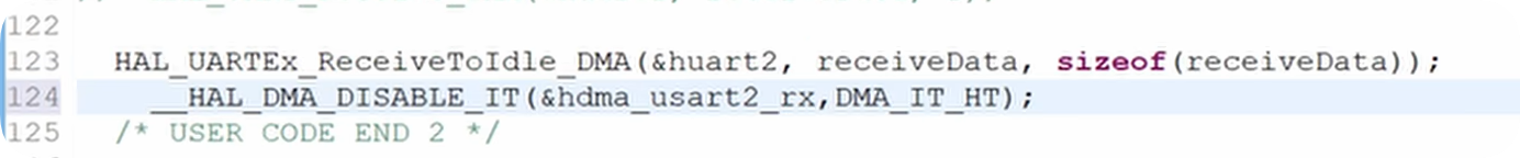 我们刚刚并未察觉是因为我们将receiveData数据设置的比较大,发送的数据又比较短,并未触发DMA传输过半中断。像我们这样使用一个很大的接收数组虽然确实能解决问题,但也是治标不治本,此问题的正确解决方案是关闭"DMA传输过半中断",用于关闭DMA中断的语句是__HAL_DMA_DISABLE_IT,第一个参数我们填写DMA通道的指针地址,也就是USART2的RX DMA通道,第二个参数是要关闭的中断,我们填写DMA传输过半中断DMA_IT_HT(Half Transfer 过半传输),别忘了程序开始时也要关闭
