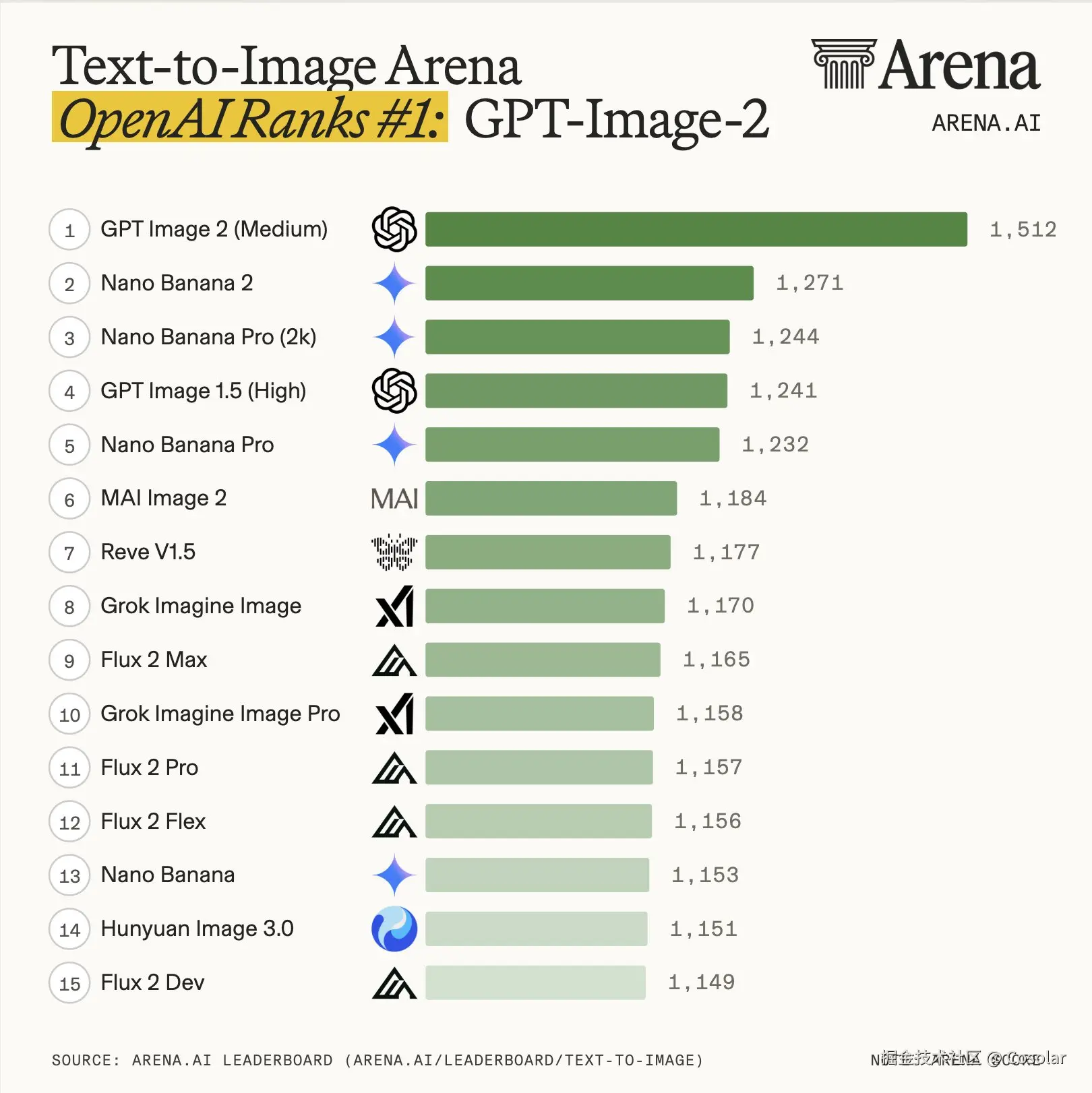本次榜单最引人注目的数据点在于榜首模型 GPT Image 2 (Medium) 的得分表现。其 1512 的 Arena Score 不仅使其稳居第一,更与第二名拉开了超过 240 分 的巨大差距。