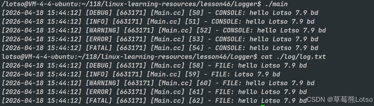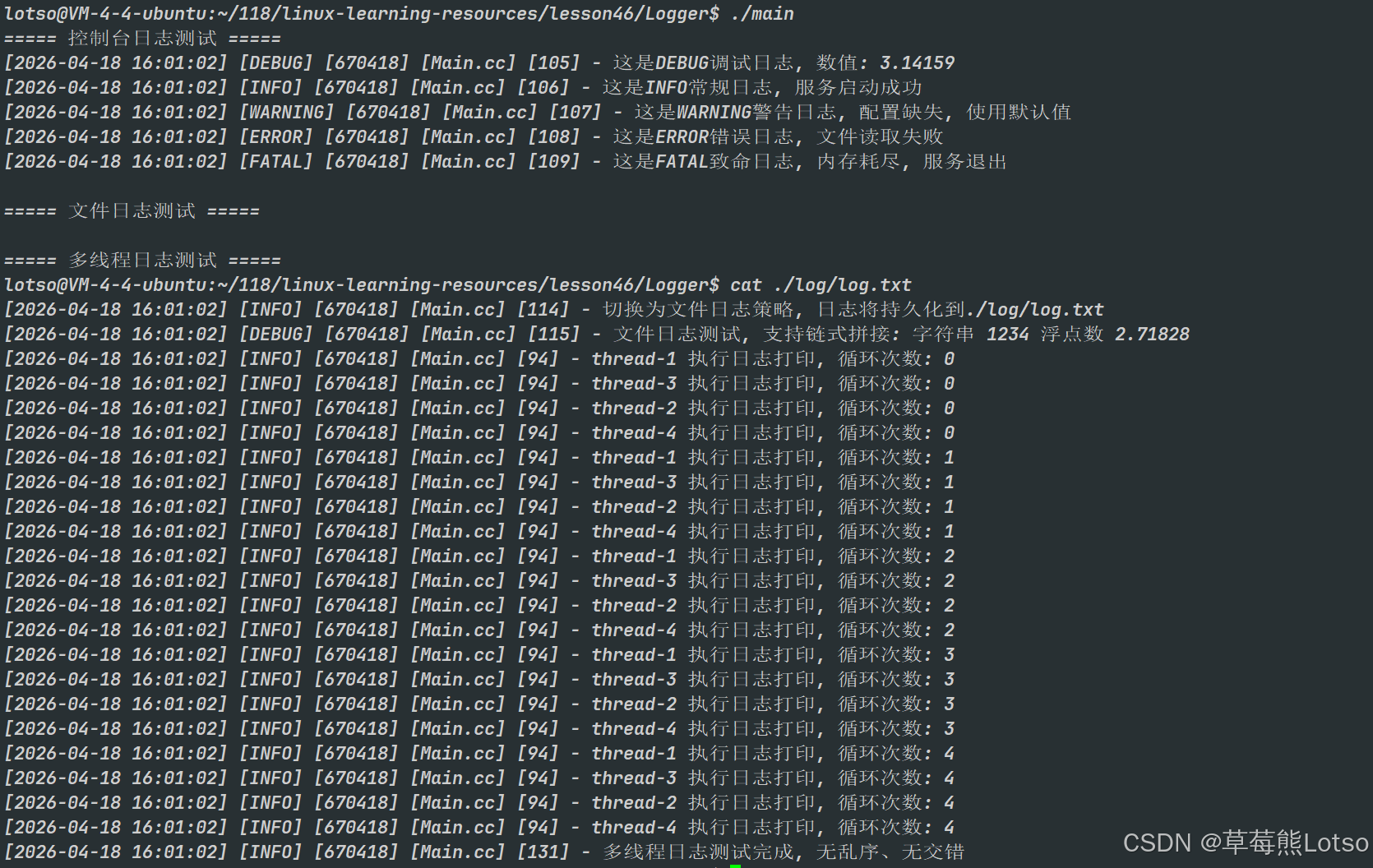 结语:从零实现一个线程安全的日志系统,不仅是造轮子的过程,更是对 Linux 多线程编程、设计模式、C++RAII 机制、可重入函数等核心知识点的深度实践。本文基于策略模式实现的日志系统,做到了格式化与刷新逻辑解耦、线程安全、使用便捷、可无限扩展,完全兼容 glog 的流式使用风格,同时通过源码级的拆解,让我们理解了成熟日志库背后的底层实现原理。在实际开发中,我们可以直接使用 spdlog 等成熟的开源库,但只有理解了底层实现,才能在遇到日志乱序、程序崩溃日志丢失、多线程性能瓶颈等问题时,精准定位并解决问题,这也是底层能力的核心价值。