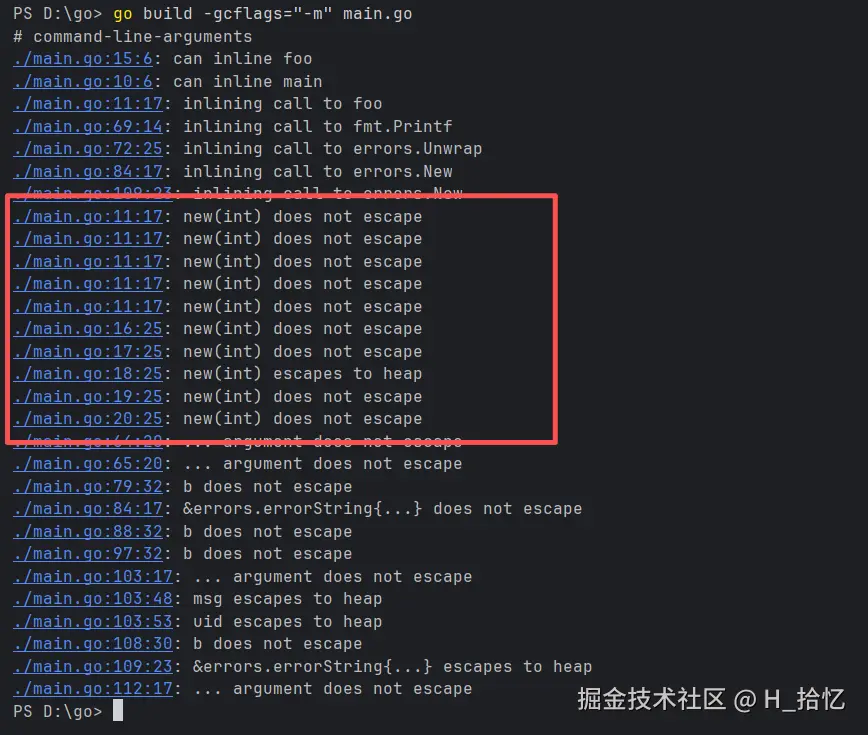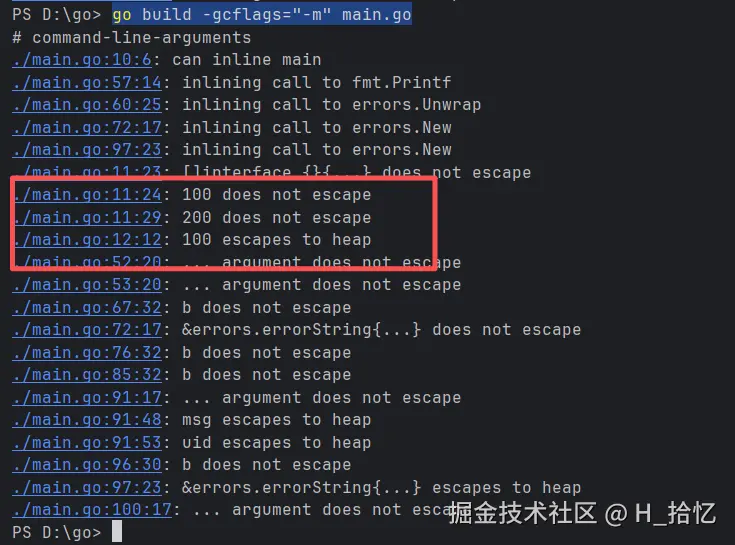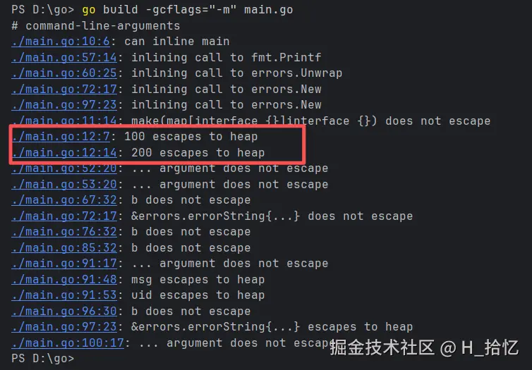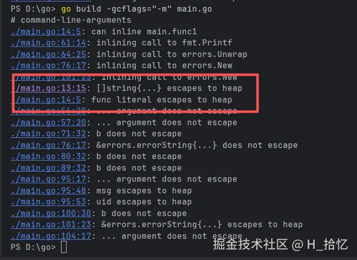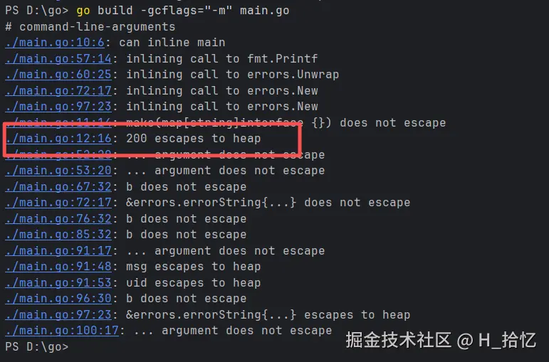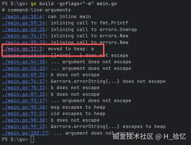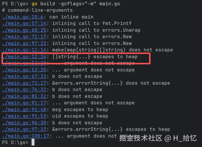 用命令go build -gcflags="-m" main.go执行可以倒如下结果.