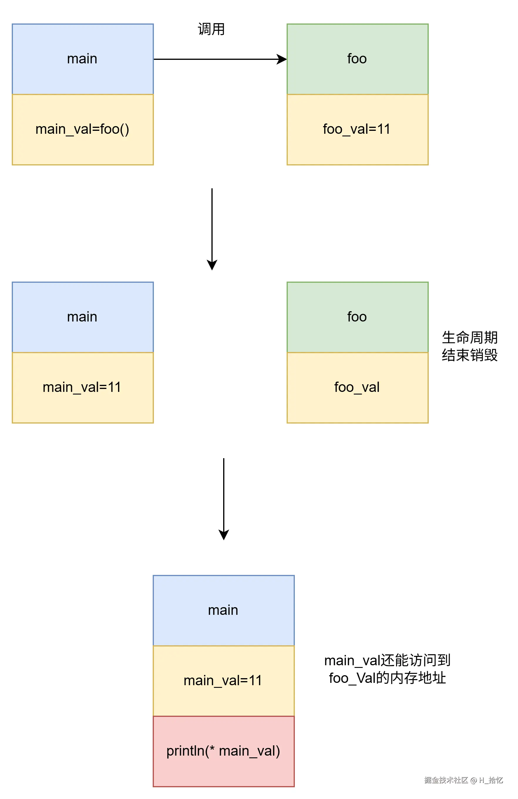 外部函数使用了子函数的局部变量.理论上来讲.子函数的foo_val的生命周期早就销毁了才对.所以在外层函数main函数中.如果访问子函数的foo_val局部变量.则一定是访问一个已经操作系统回收的空间.