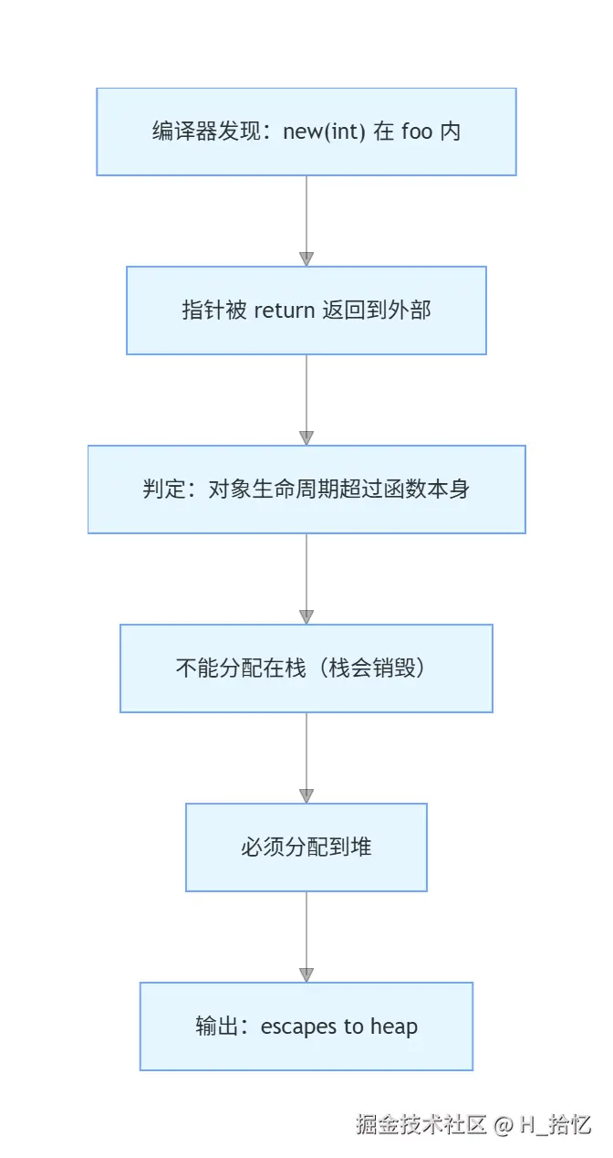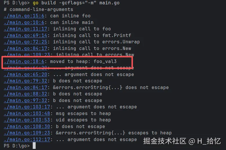 在编译的时候foo_val3被编译器判定为逃逸变量.因此将foo_val3放到堆中开辟.