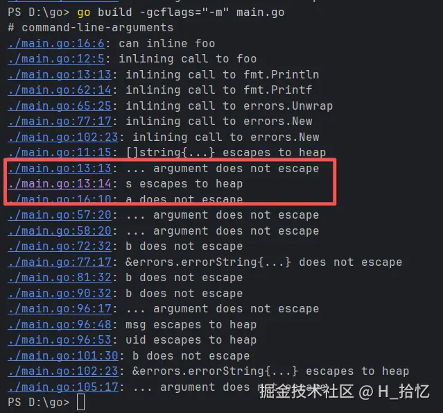 通过结果得知s escapes to heap.s被逃逸到堆上.
