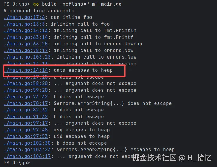 通过结果得知data已经被逃逸到堆上.