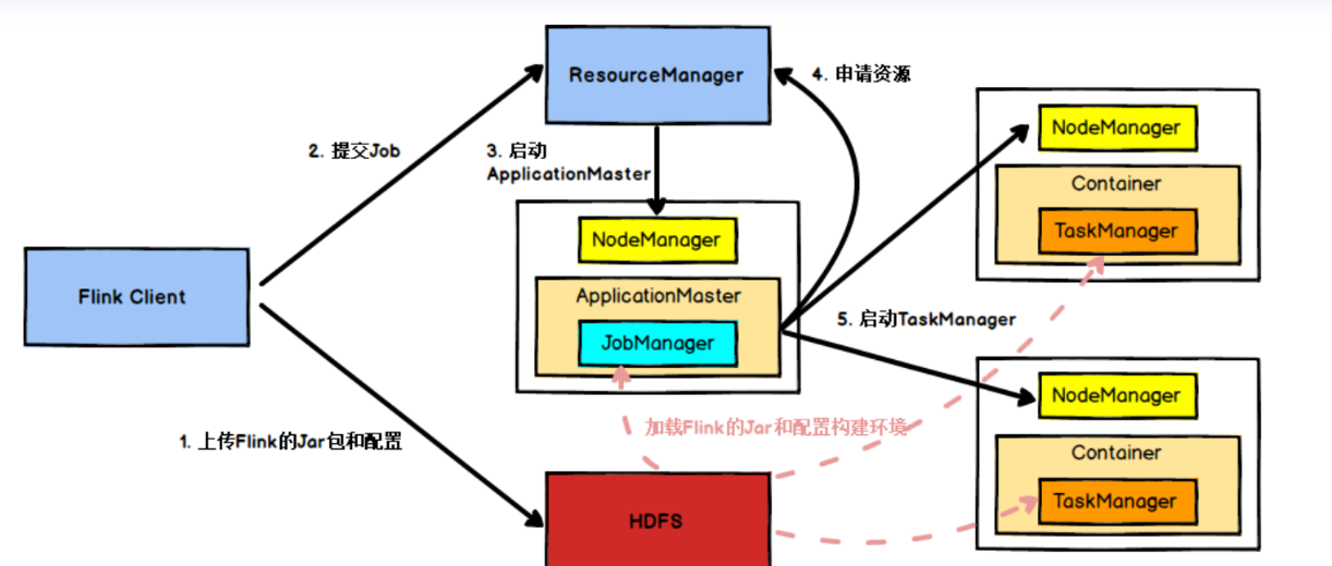 - Flink将作业提交的请求发生到RM,其中请求信息包含作业Jar和配置的存储路径以及运行的信息