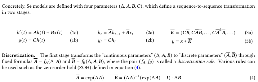 其中,A,B,C\mathbf{A}, \mathbf{B}, \mathbf{C}A,B,C为可学习参数矩阵。离散化后(如零阶保持ZOH):