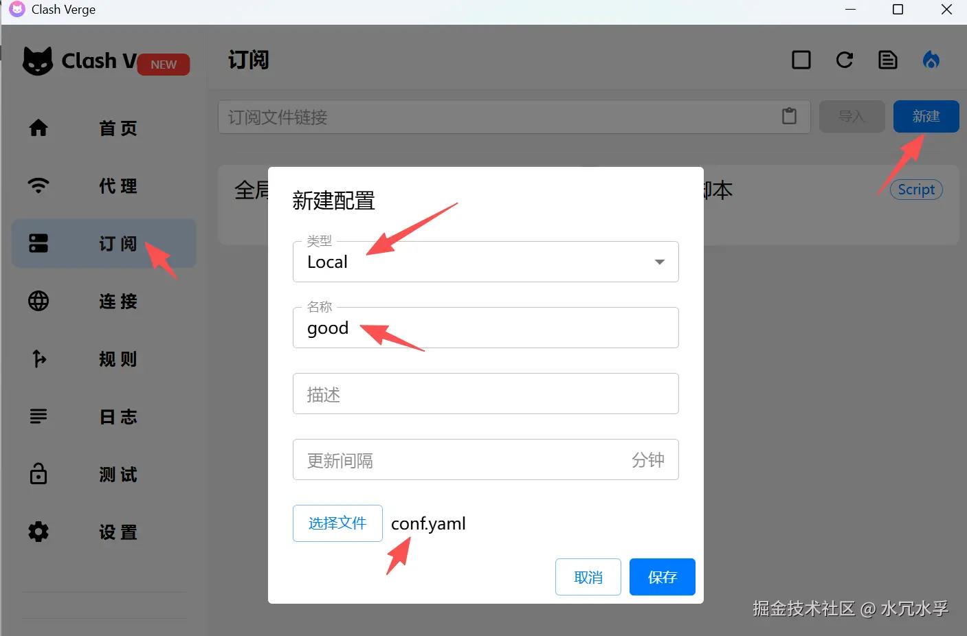 然后,在clash的订阅这里,新建、Local、随便起个名字,再上传刚刚准备好的订阅conf.yaml配置文件