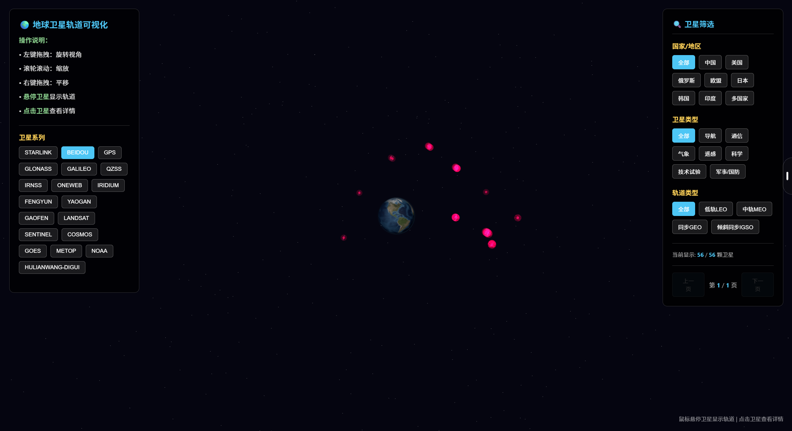 本文所涉及的项目是基于Three.js开发的卫星轨道3D可视化平台,支持加载真实TLE卫星数据或自定义卫星轨道参数,实现卫星公转、自转、轨道渲染等核心功能。平台核心需求是:既要保证卫星轨道运动的物理真实性(如公转方向与地球自转一致、角速度符合轨道参数),也要具备良好的视觉观赏度,让用户能清晰区分每颗卫星的位置和运动轨迹。