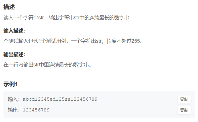 遍历整个字符串,遇到数字的时候,用双指针找出这段连续的数字子串,根据此时的长度更新起始位置和长度。