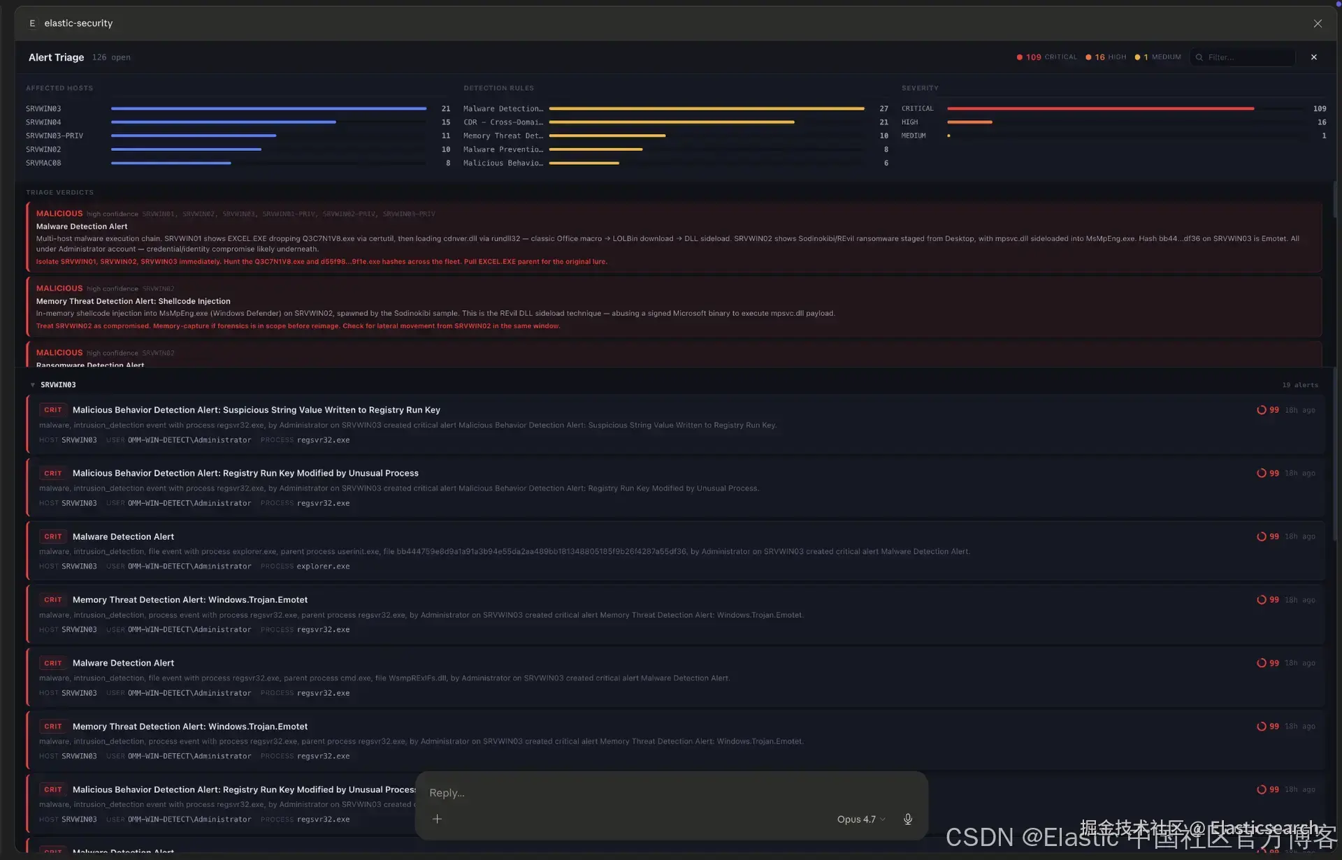 安全 MCP App 返回的是整个工作流本身。分析师向代理发出提示,代理会在聊天中返回一个交互式仪表板,分析师可以在其中深入分析告警、执行威胁狩猎、关联攻击链并创建案件,整个过程中都不会丢失对话上下文。而且由于所有发现、查询和案件都会回写到 Elasticsearch,同一个调查也会在 Kibana 中保留,在对话结束后分析师可以继续处理。