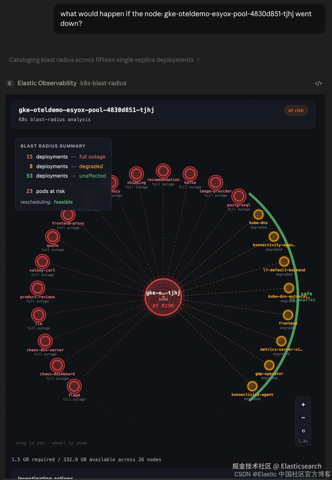 当你询问"如果我的 k8s 节点宕机会发生什么?"时,会得到一个放射状影响图:目标节点位于中心位置,完全中断的部署以红色标识,性能下降的以琥珀色标识,未受影响的以灰色标识。