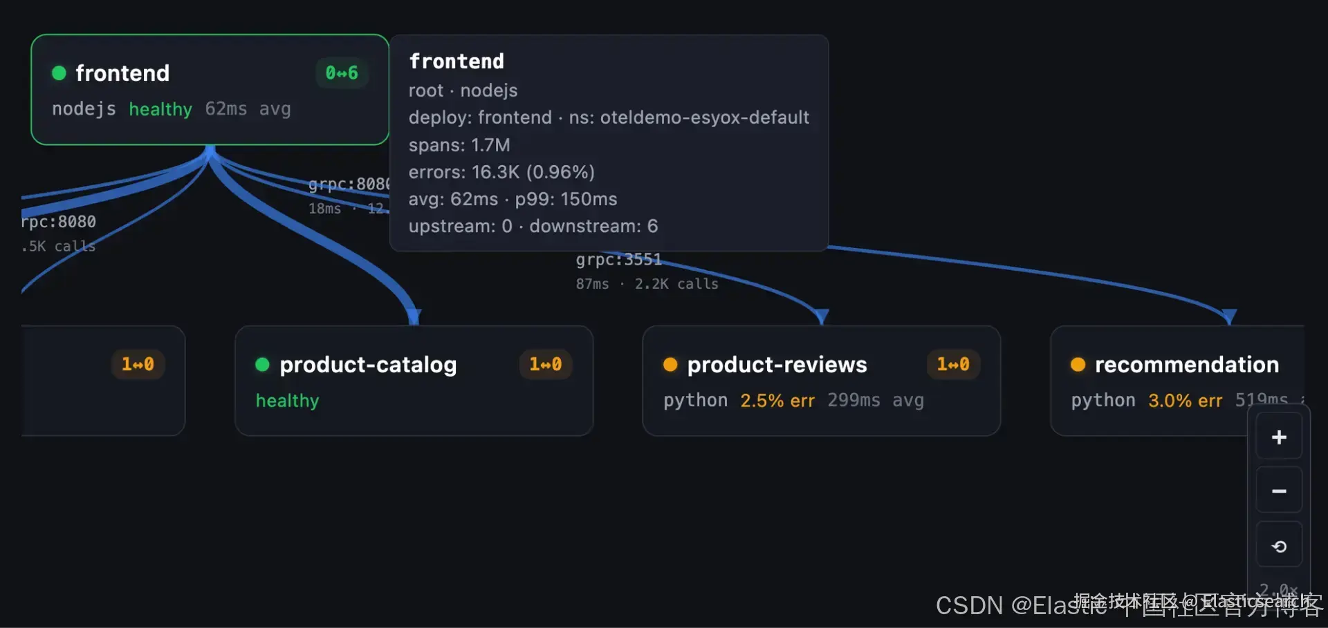 支持缩放、平移和悬停操作,以获取理解复杂服务关系所需的全部细节: