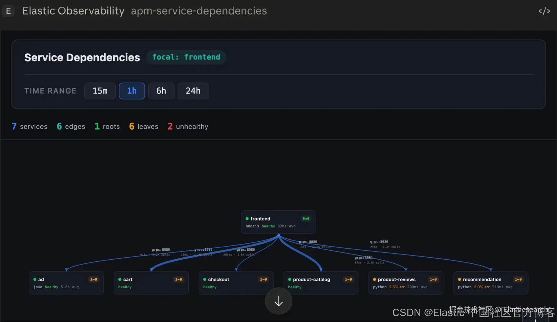 | apm-service-dependencies | Elastic APM | 服务依赖图谱------上游/下游关系、协议、调用量 |
