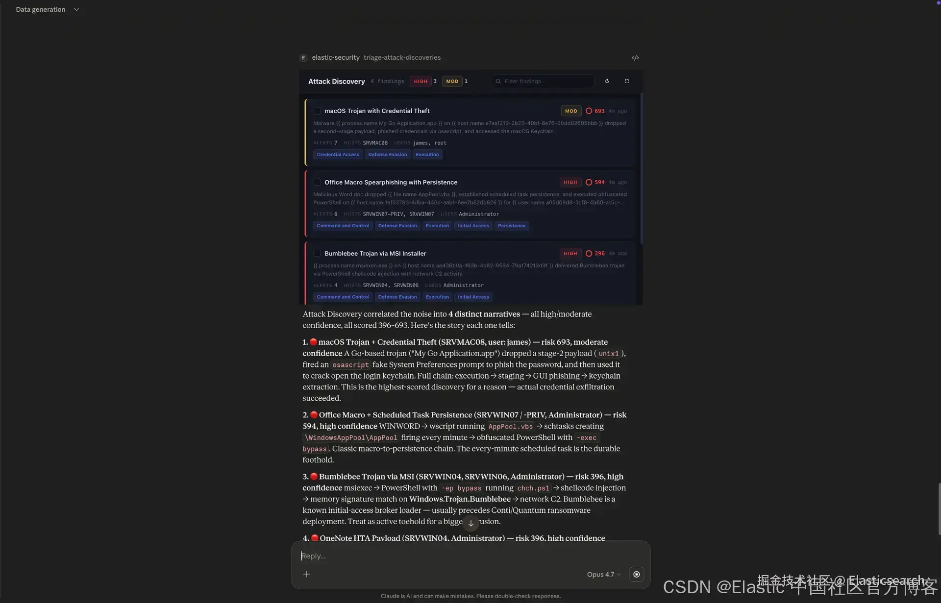运行攻击发现。Attack Discovery skill 会触发 Attack Discovery API,并返回一个按优先级排序的发现列表。每个发现都是一组相关告警,被拼接成一条攻击链,并在前端展示 MITRE 战术、风险评分、置信度标签,以及受影响的主机和用户。