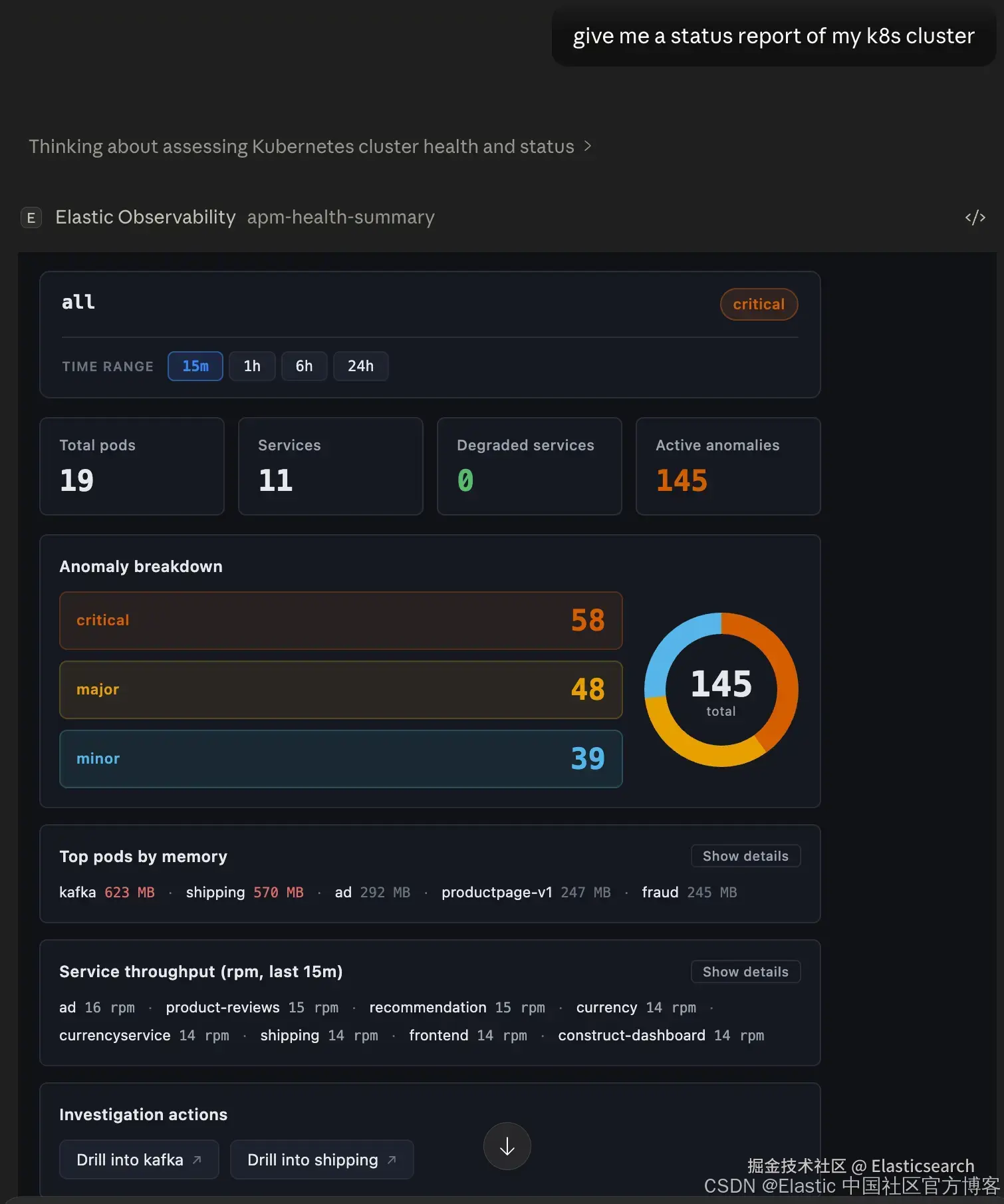 当你询问 "哪里出问题了?" 或 "给我一份状态报告" 时,会得到一次性的全局概览:整体健康状态徽标、存在问题的服务及其原因、内存占用最高的 Pod、异常严重程度分布以及服务吞吐量------全部集中在一个内联视图中。
