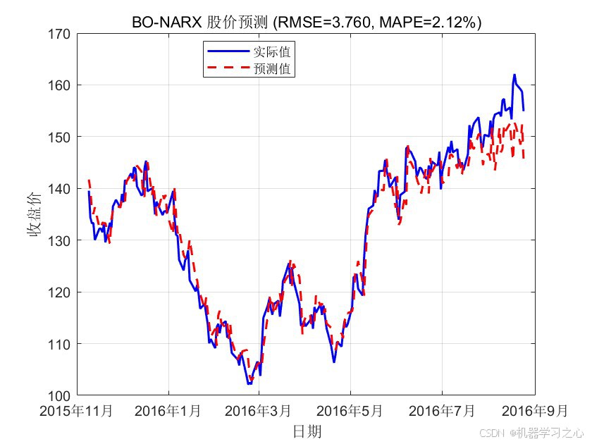 股票价格预测是金融时间序列分析中的核心问题。由于股价具有非线性、高噪声和非平稳等特征,传统线性模型(如ARIMA)难以充分捕捉其动态规律。非线性自回归外生(NARX)神经网络能够结合历史收盘价的自回归项与外部影响因素(成交量、开高低价),对复杂非线性关系进行建模。为了减少人工调参的主观性和计算成本,引入贝叶斯优化(BO)自动确定最优超参数(滞后阶数、隐藏层大小、正则化系数),从而提升预测精度与模型泛化能力。