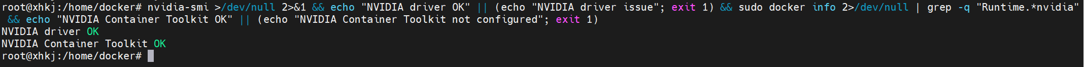 nvidia-smi >/dev/null 2>&1 && echo "NVIDIA driver OK" || (echo "NVIDIA driver issue"; exit 1) && sudo docker info 2>/dev/null | grep -q "Runtime.*nvidia" && echo "NVIDIA Container Toolkit OK" || (echo "NVIDIA Container Toolkit not configured"; exit 1)