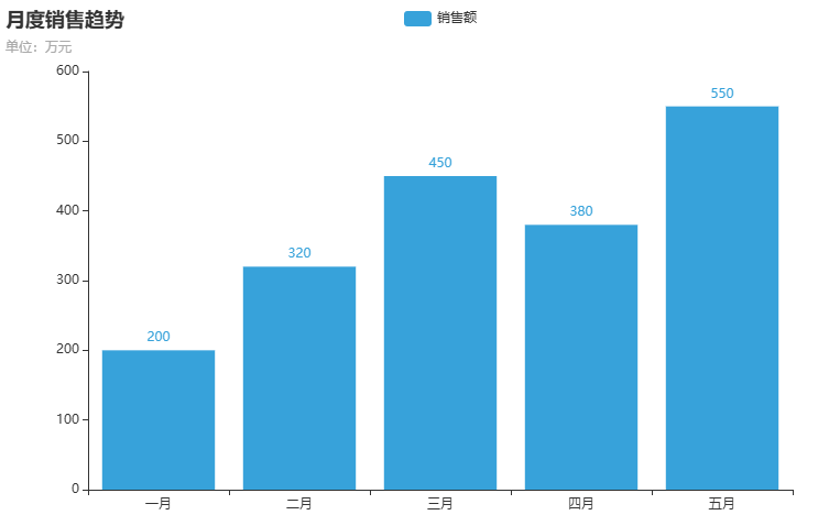 title_opts=opts.TitleOpts(title="月度销售趋势", subtitle="单位:万元"),