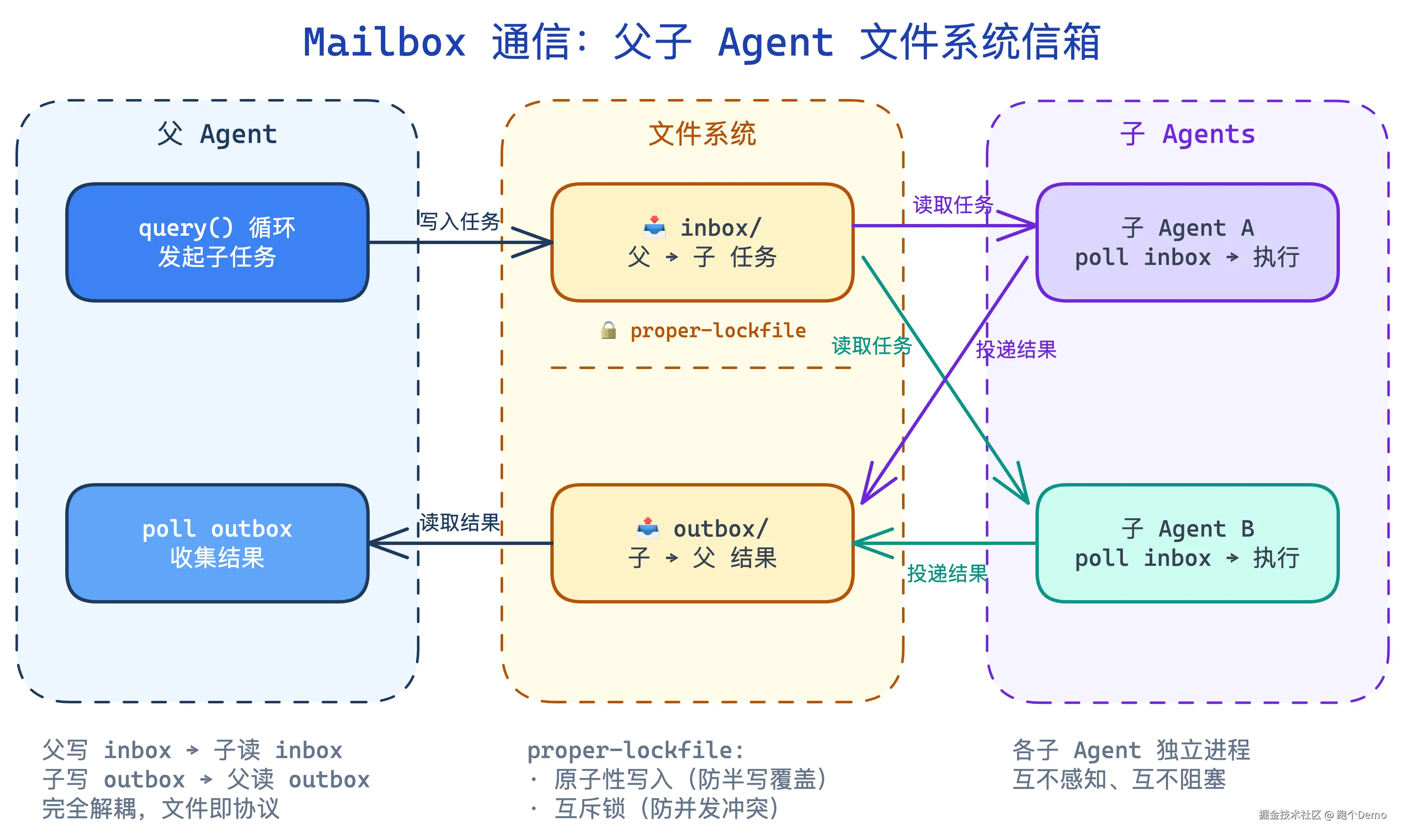 | 通信方式 | 文件系统 Mailbox + proper-lockfile | 内存 State 对象传递 | 消息队列传递 |